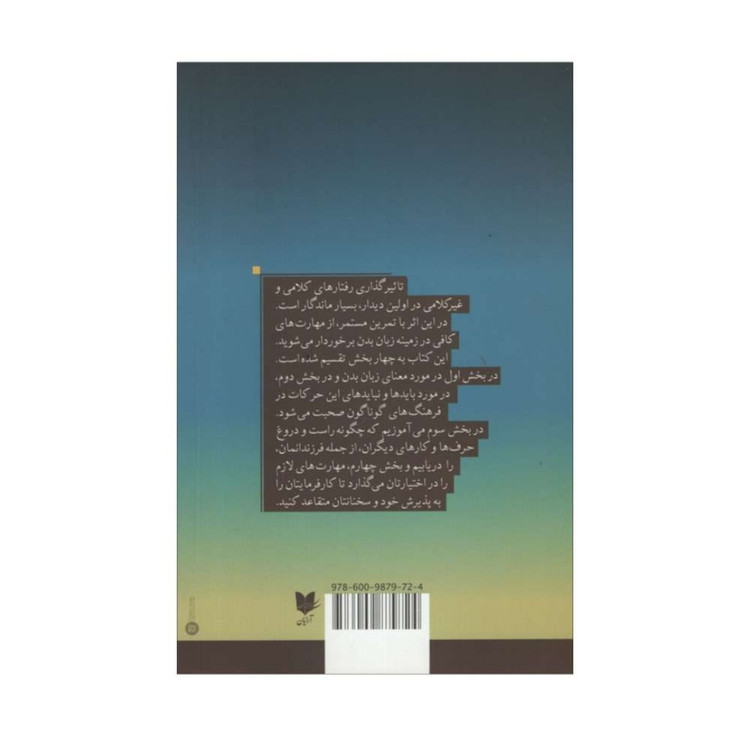 تاثیرگذاری رفتارهای کلامی و غیرکلامی در اولین دیدار، بسیار ماندگار است. در این اثر با تمرین مستمر، از مهارت های کافی در زمینه زبان بدن برخوردار می شوید. این کتاب، به چهار بخش مستقیم شده است. در بخش اول در مورد معنای زبان بدن و در بخش دوم، در مورد بایدها و نبایدهای این حرکات در فرهنگ های گوناگون صحبت می شود. در بخش سوم می آموزیم که چگونه راست و دروغ حرف ها و کارهای دیگران، از جمله فرزندانمان، را دریابیم و بخش چهارم، مهارت های لازم را در اختیارتان می گذارد تا کارفرمایتان را به پذیرش خود و سخنانتان متقاعد کنید.